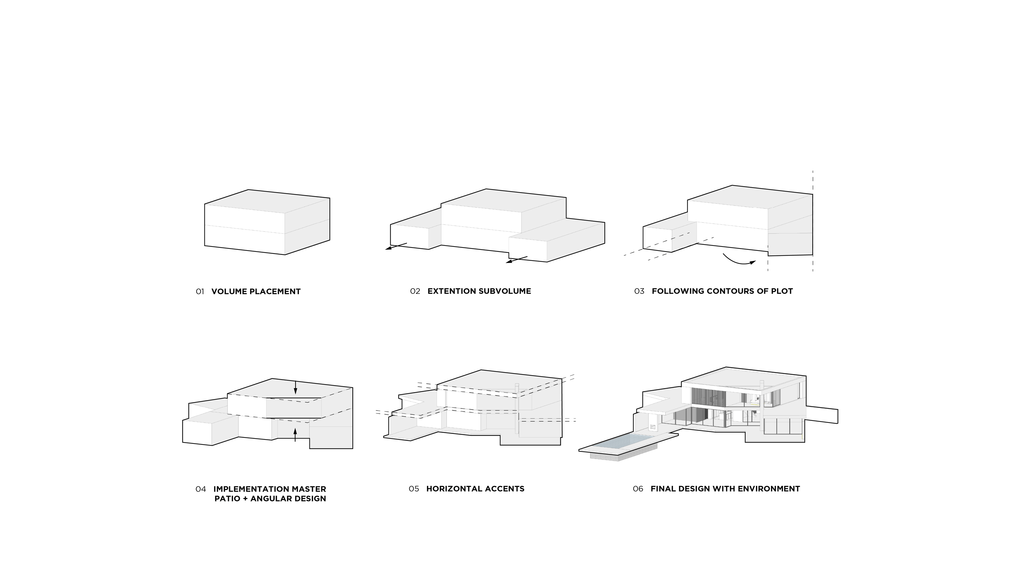 The design originates from one main volume with two sub-volumes on either side. These sub-volumes are subsequently angled towards the contours of the plot, opening up the design and creating a certain harmony. The floors are accentuated by horizontal lines, making the design feel even more open.