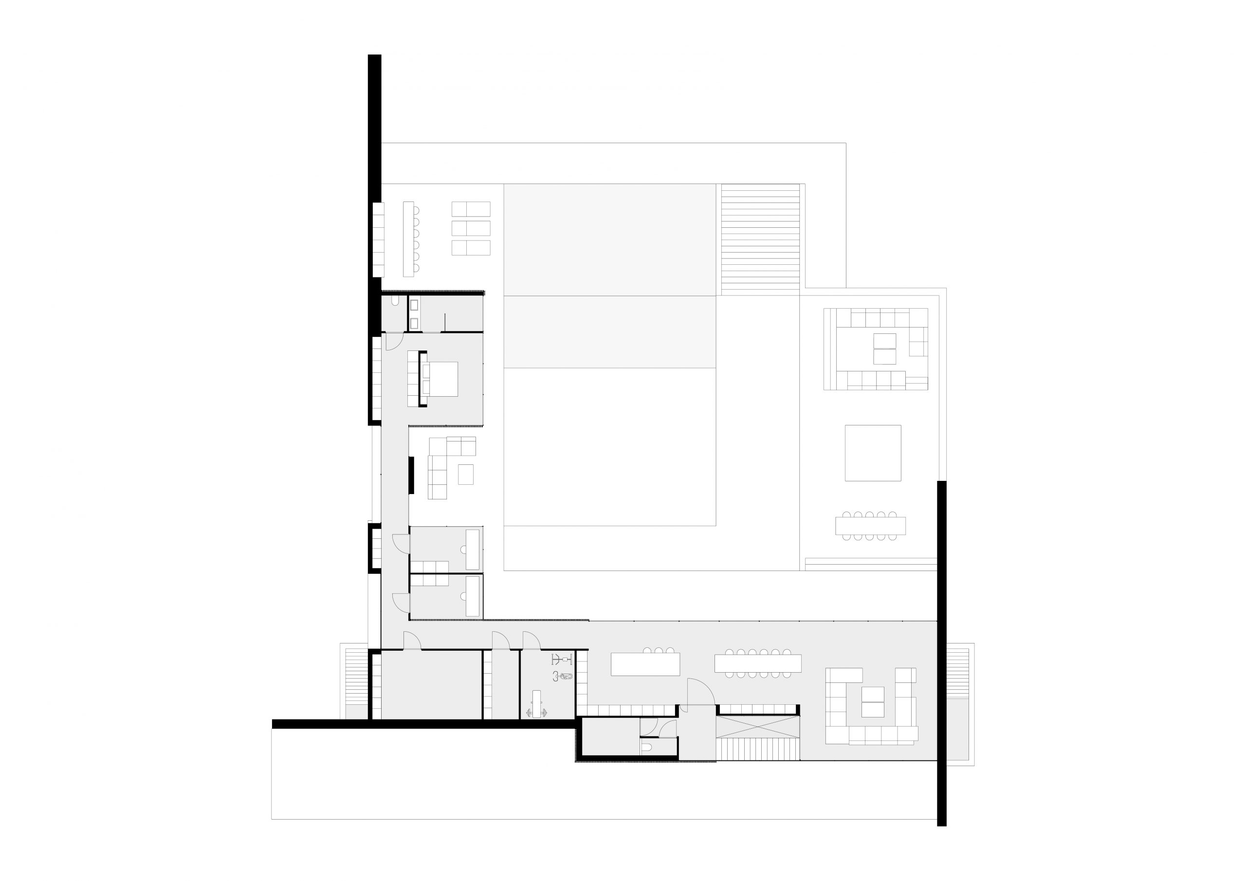 The starting point of the concept are two L-shapes stacked on top of each other on one axis. These two L-shapes embrace the central patio and each other, connecting the two families visually and physically. Privacy is kept by extending walls to create internal spaces.