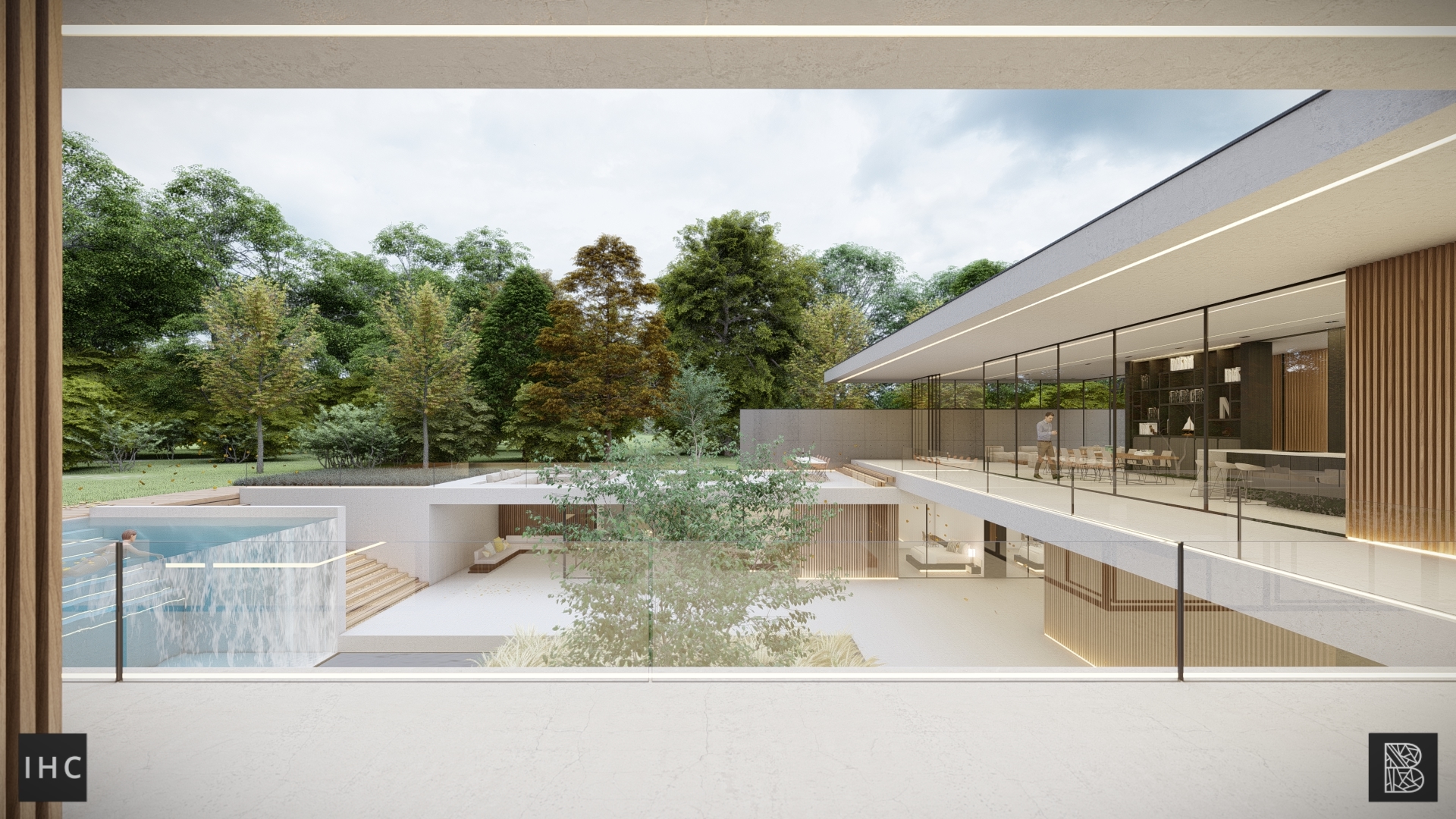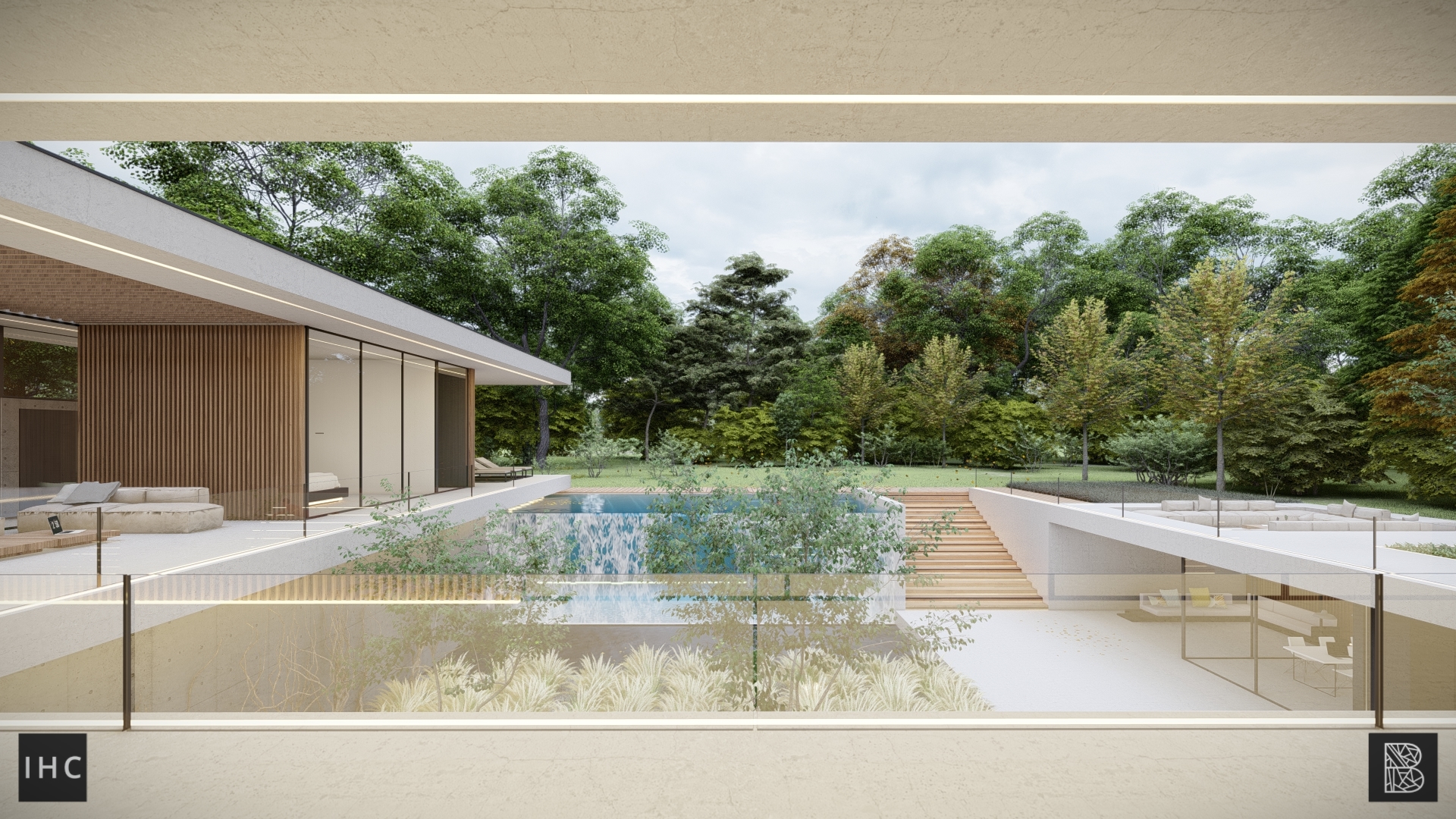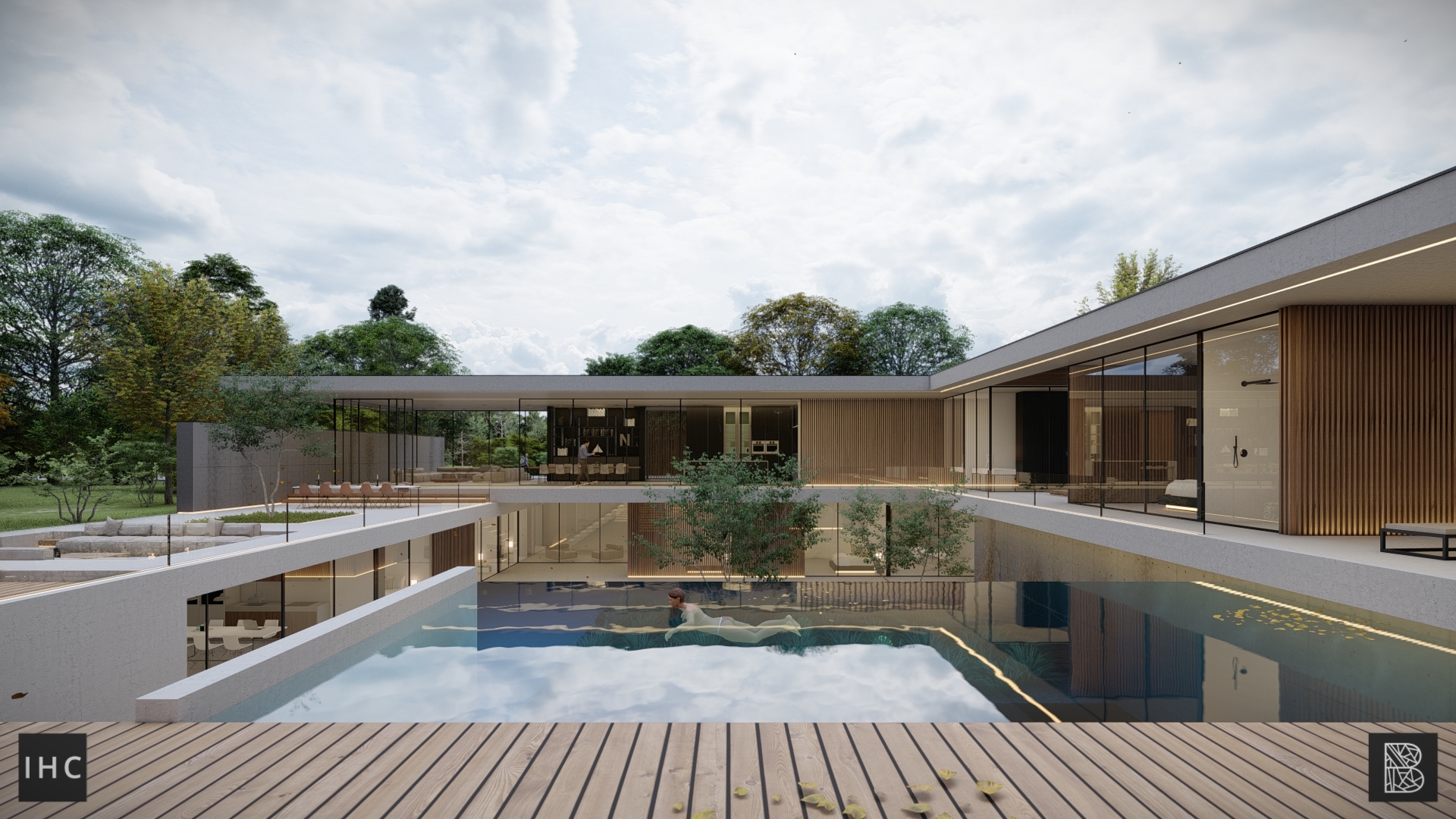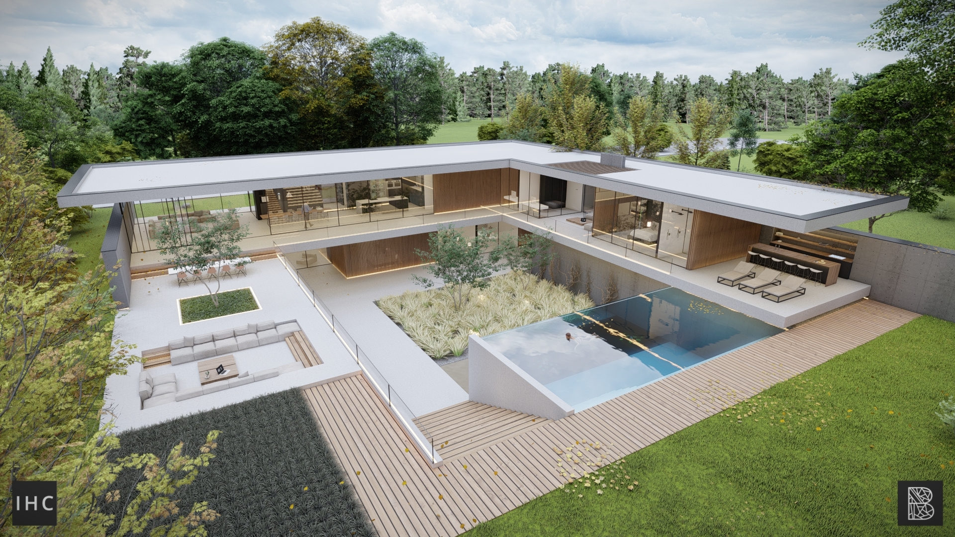 The central patio is the focal point of the house. The wings fold around this element, creating a strong connection between the interior and exterior. Additionally, the patio provides privacy, allowing both levels to have their own gardens. The infinity-edge pool extends into the pond at the basement level.