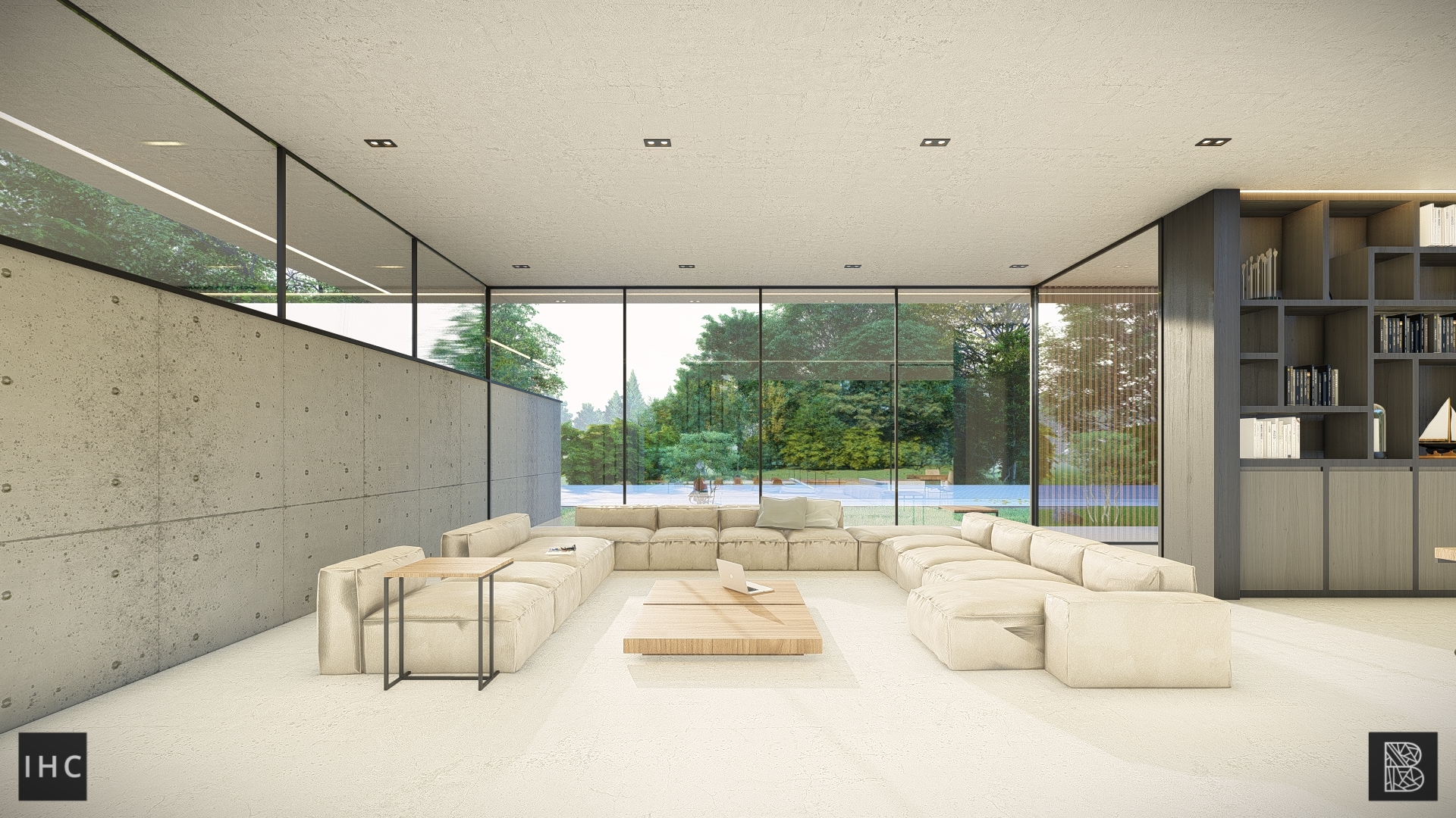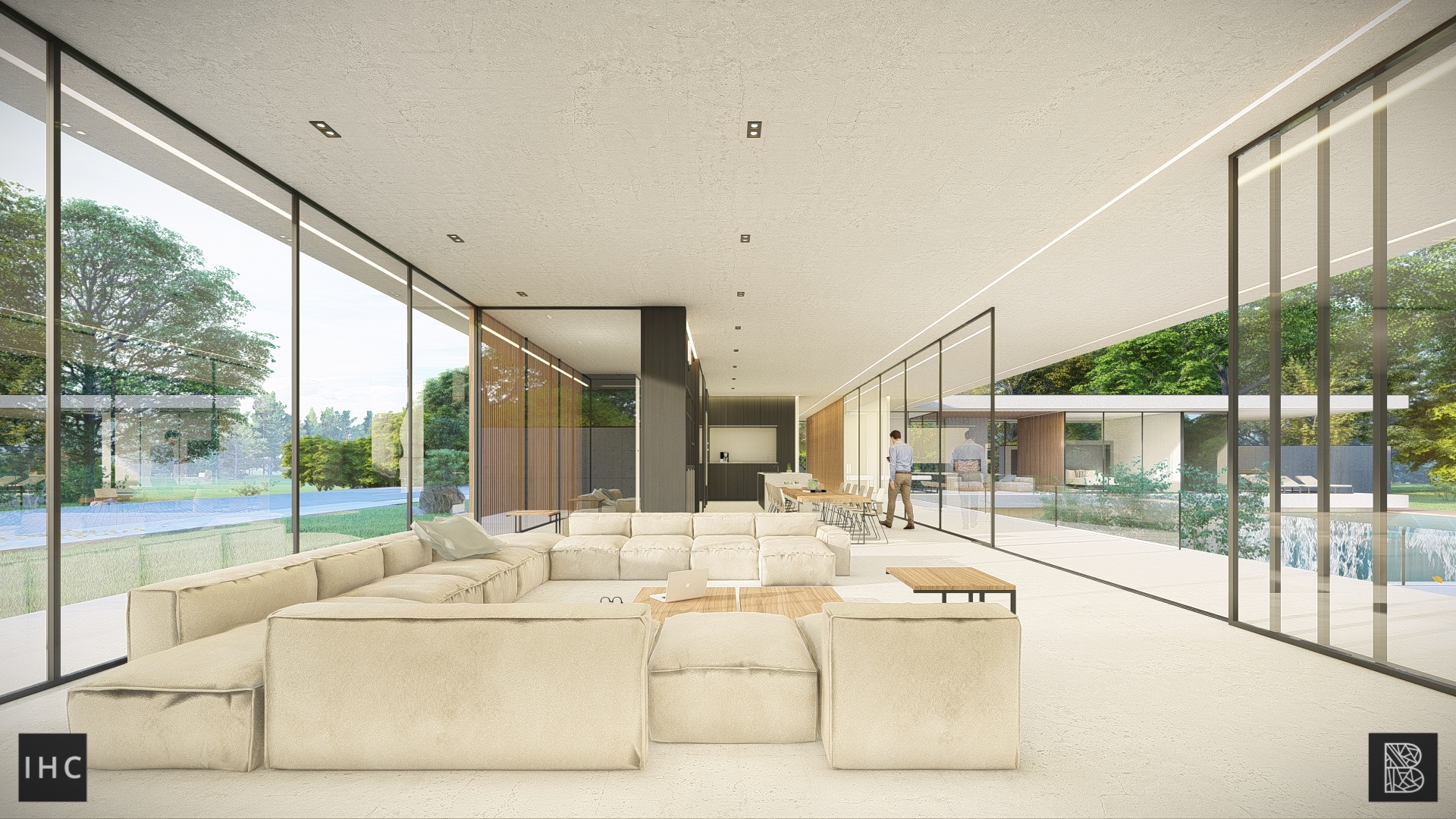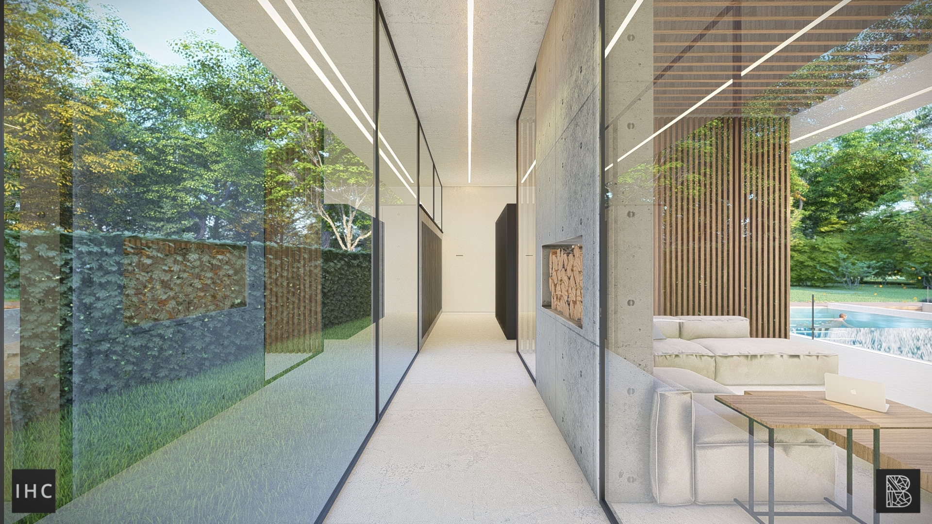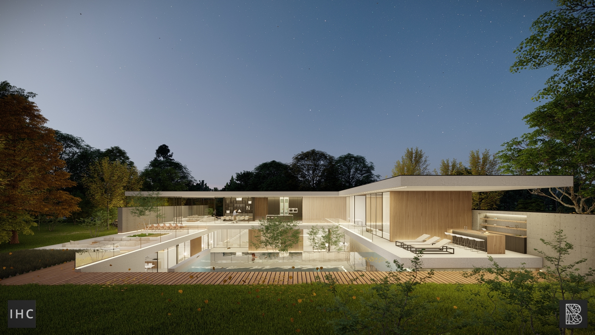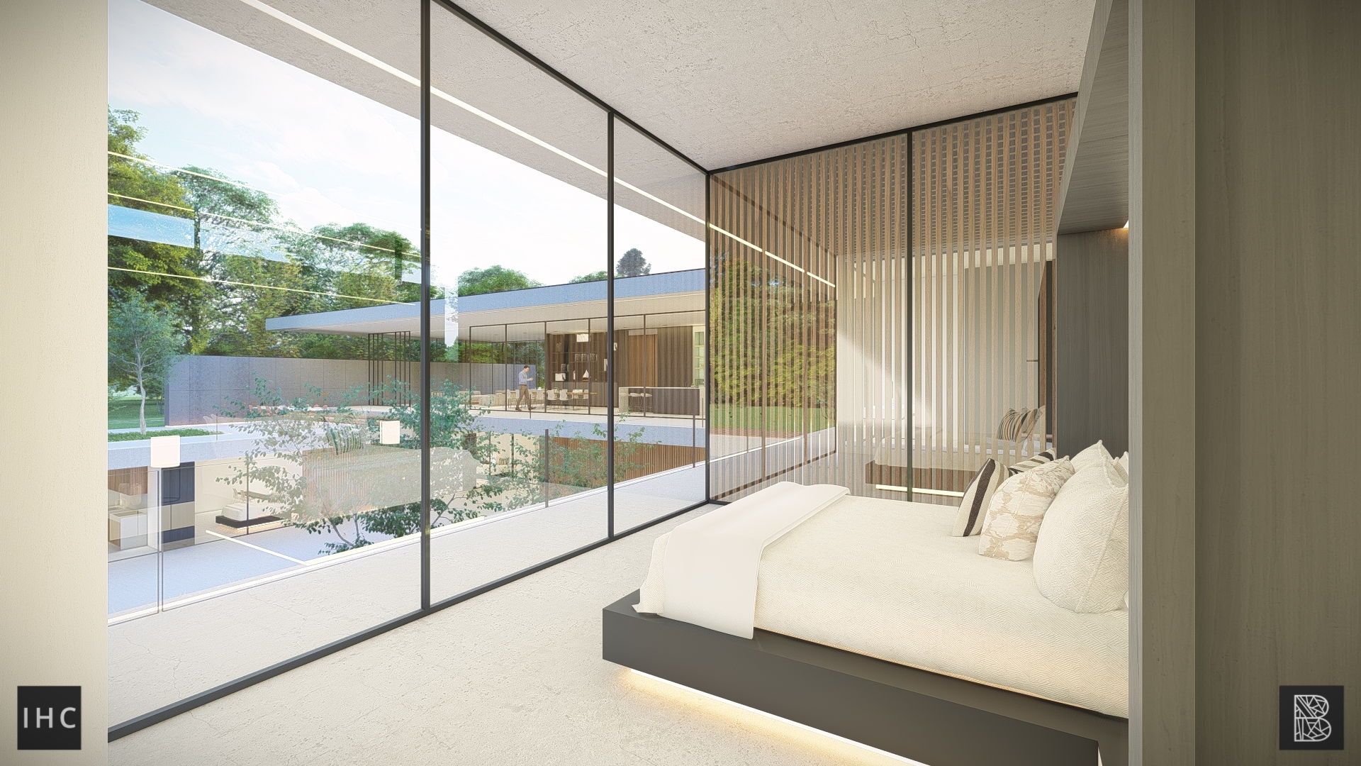 The central patio is the focal point of the house. The wings fold around this element, creating a strong connection between the interior and exterior. Additionally, the patio provides privacy, allowing both levels to have their own gardens. The infinity-edge pool extends into the pond at the basement level.
