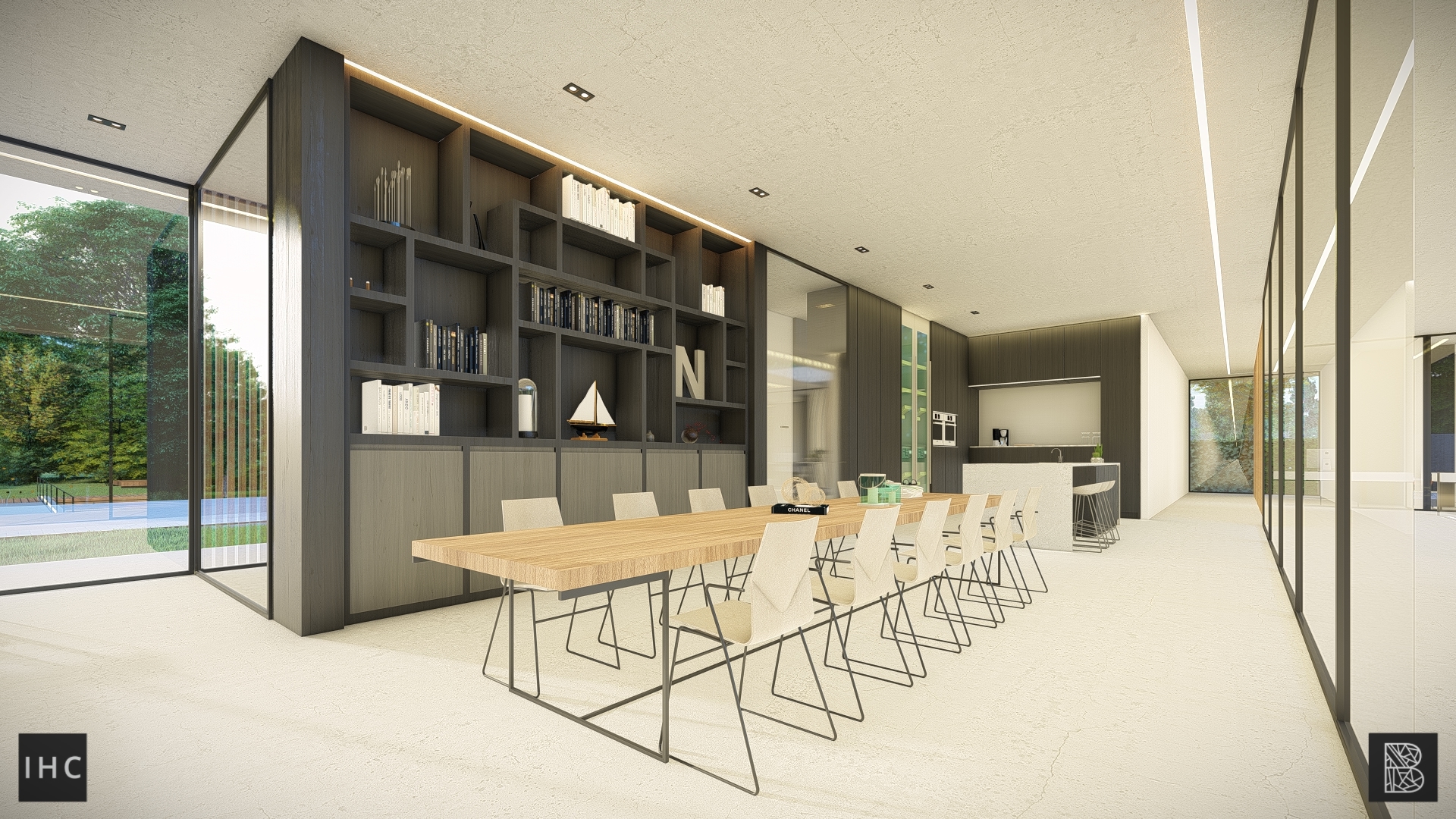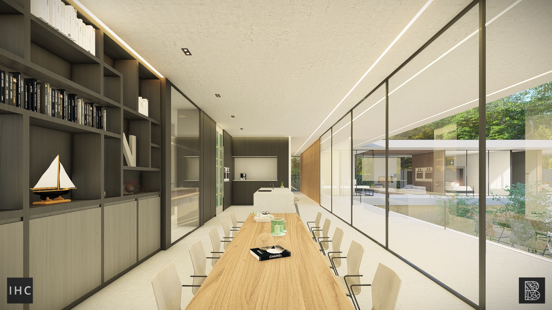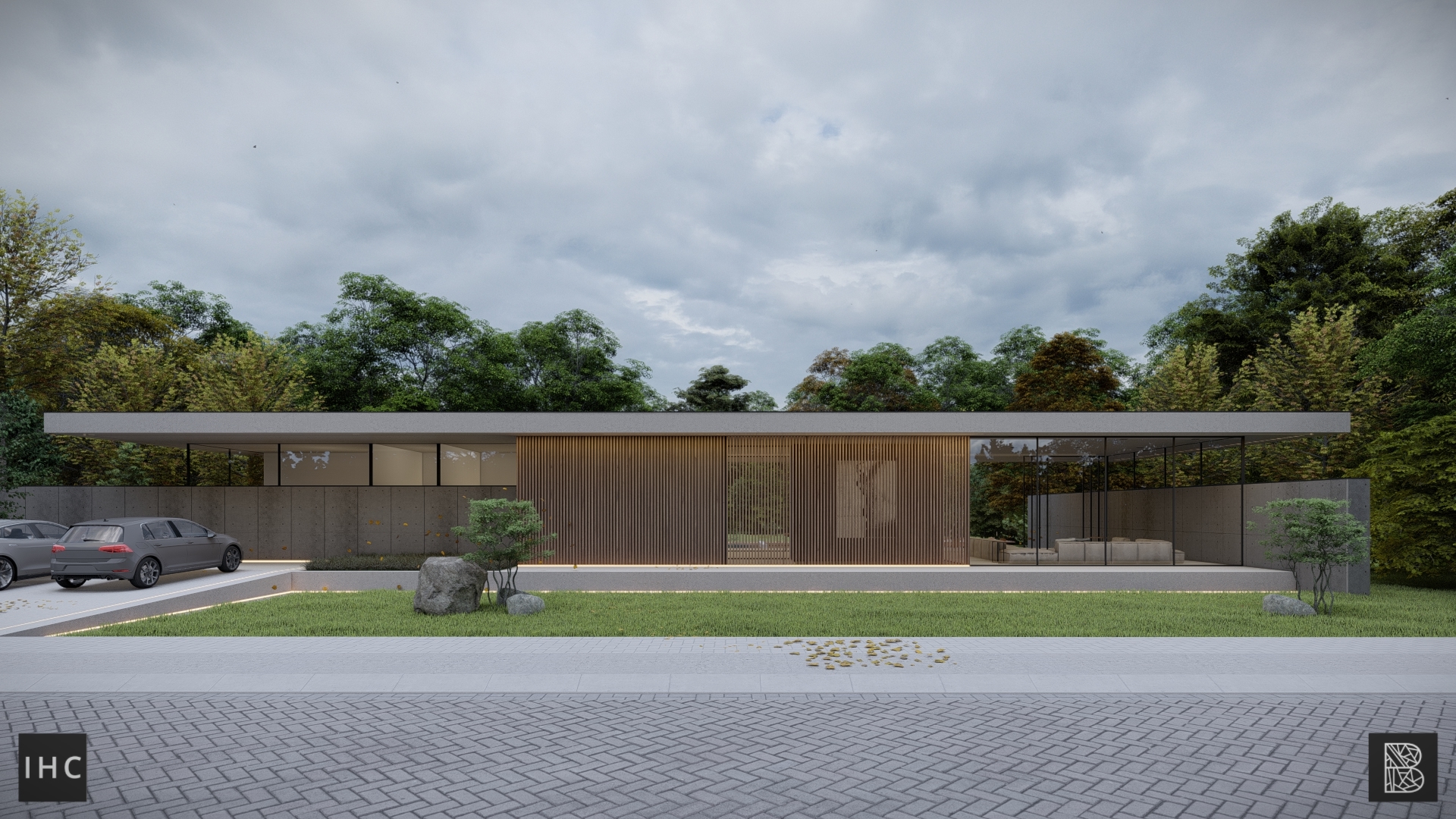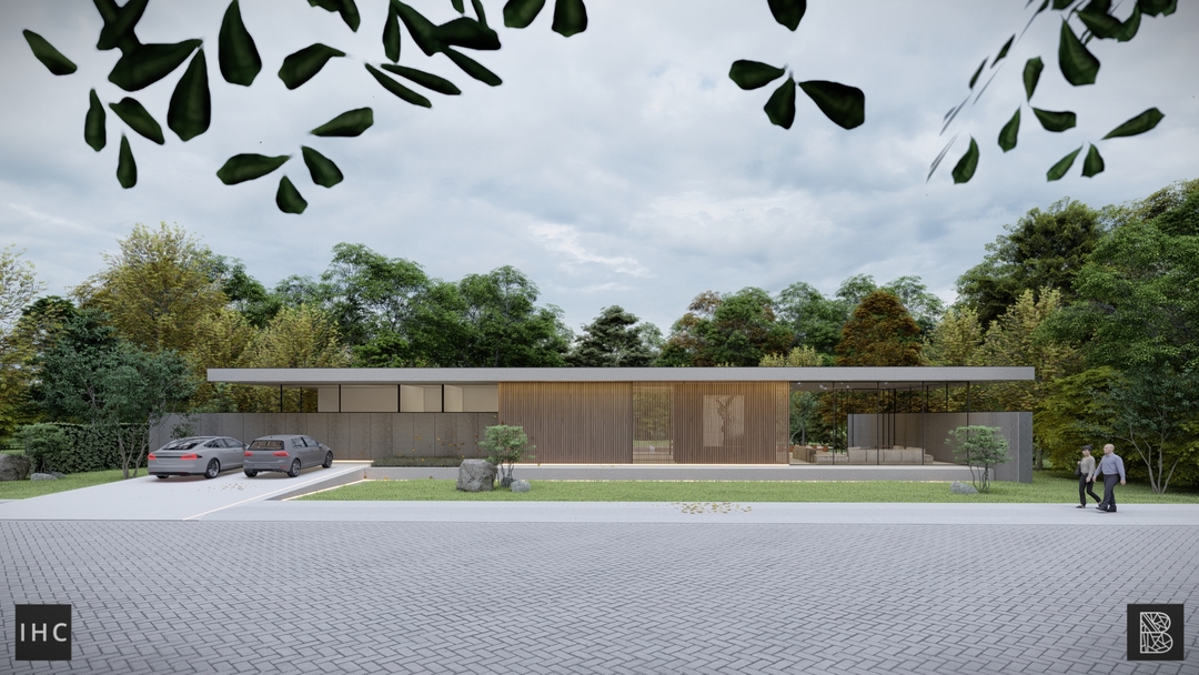 The unique architecture is emphasized by its raw materialization. Concrete in its purest form is allowed to shine as a steady base, creating serenity through simplicity and repetition throughout the building. This is contrasted by the natural aesthetic wood has, creating balance while continuing the vertical repetition. The floors and roof have a smooth concrete finish to keep the material usage simple and not overshadow the expressive architecture. With thin window frames, views are minimally obstructed and plenty of natural daylight can enter. Finally, the building is lit with LED lines, highlighting important architectural choices and illuminating the architecture evenly.