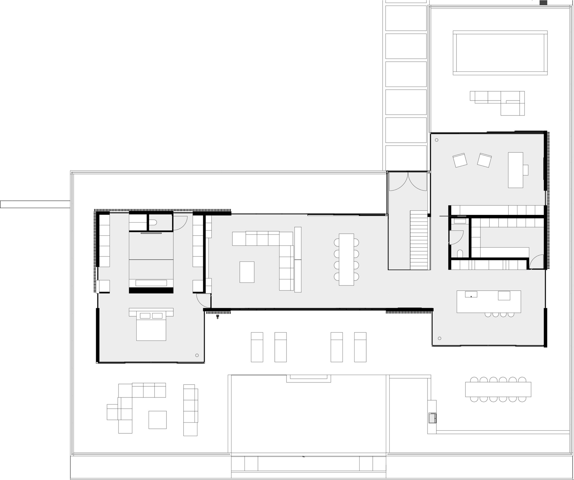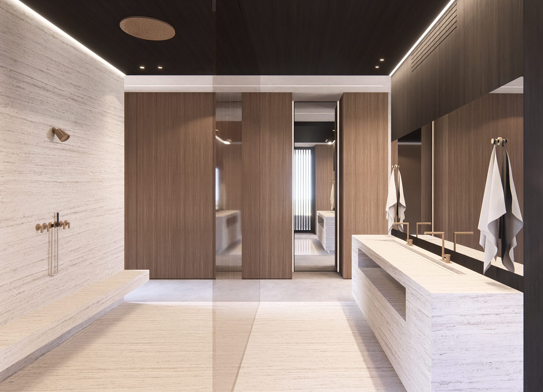 Horizon House, nestled in the natural expanse of Coral Estate, seamlessly integrates into its surroundings. Using horizontal lines to form a symmetrical composition, the design splits into two wings, demarcated by a contrasting pool and central section. Natural yet raw materials create a striking contrast, guiding focus towards panoramic views. The exterior connects intimately with the interior, featuring elements like a palm penetrating the roof and integrated planters. Inside, a modern, minimalist interpretation of tropical aesthetics emerges, characterized by defined sightlines, dark wood finishes and recurring eucalyptus wooden niches for vertical emphasis.