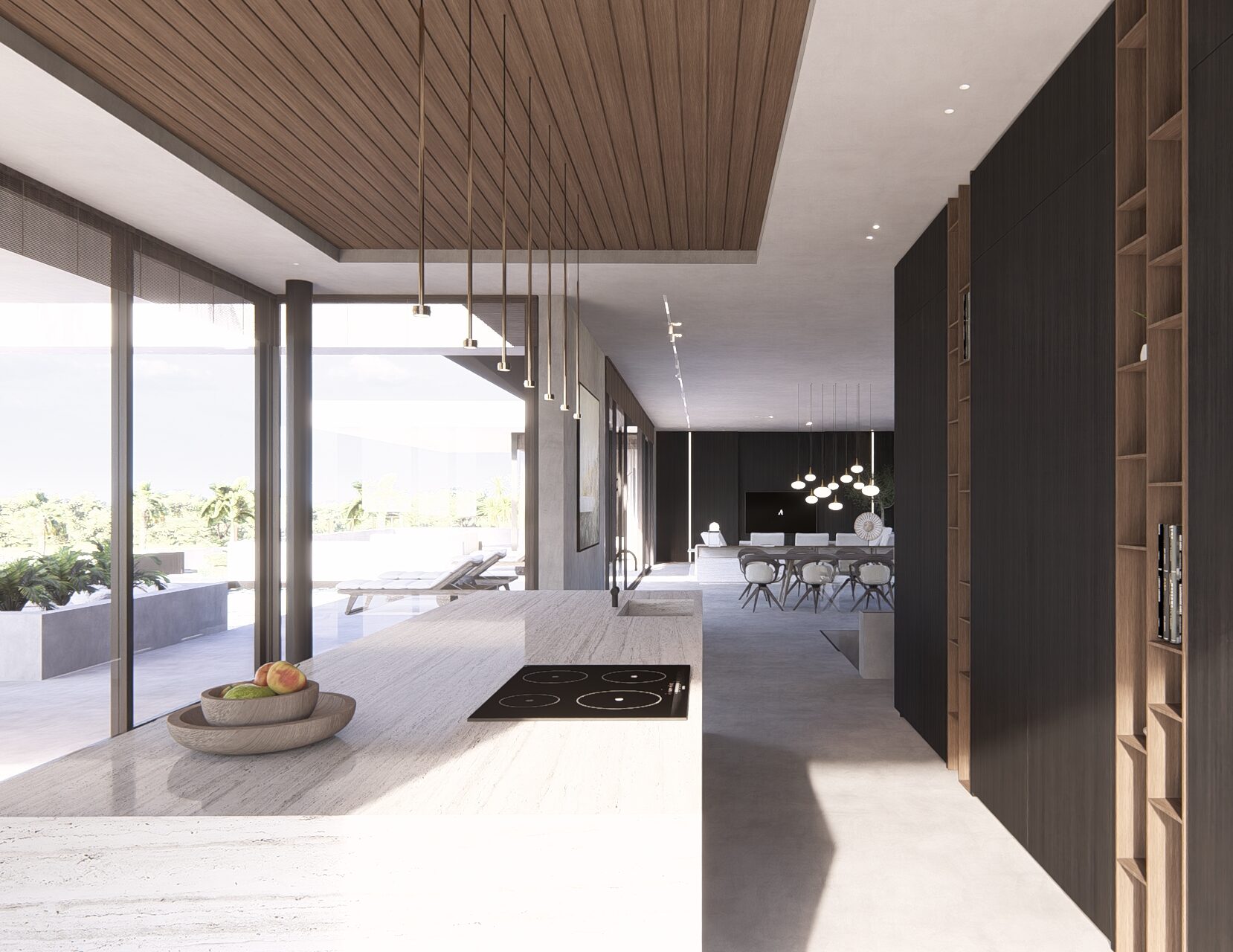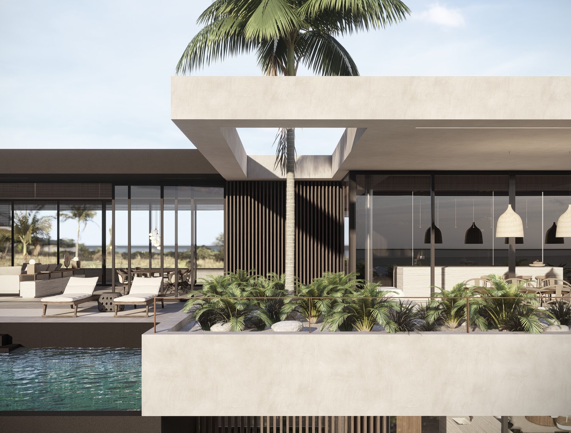 Contrasting materials and textures come together to shape an exclusive villa concept. Natural elements such as concrete, wooden panels, and black stucco blend seamlessly, creating a unique architectural expression that harmonizes with the Caribbean landscape.