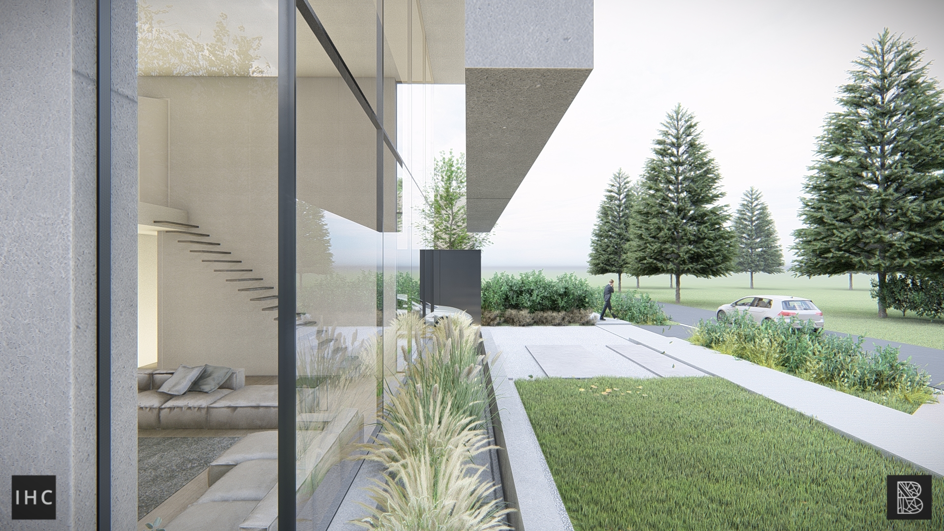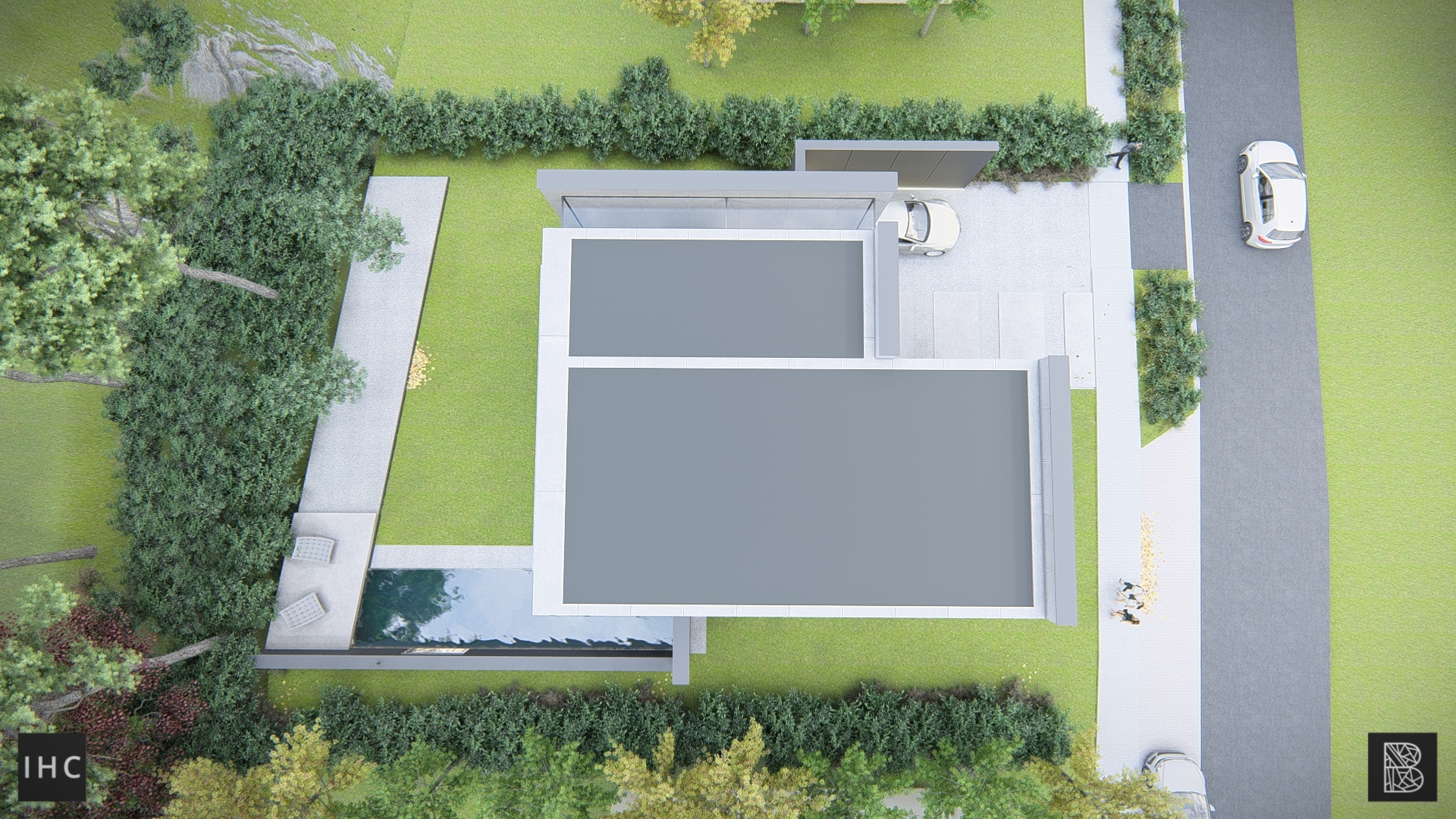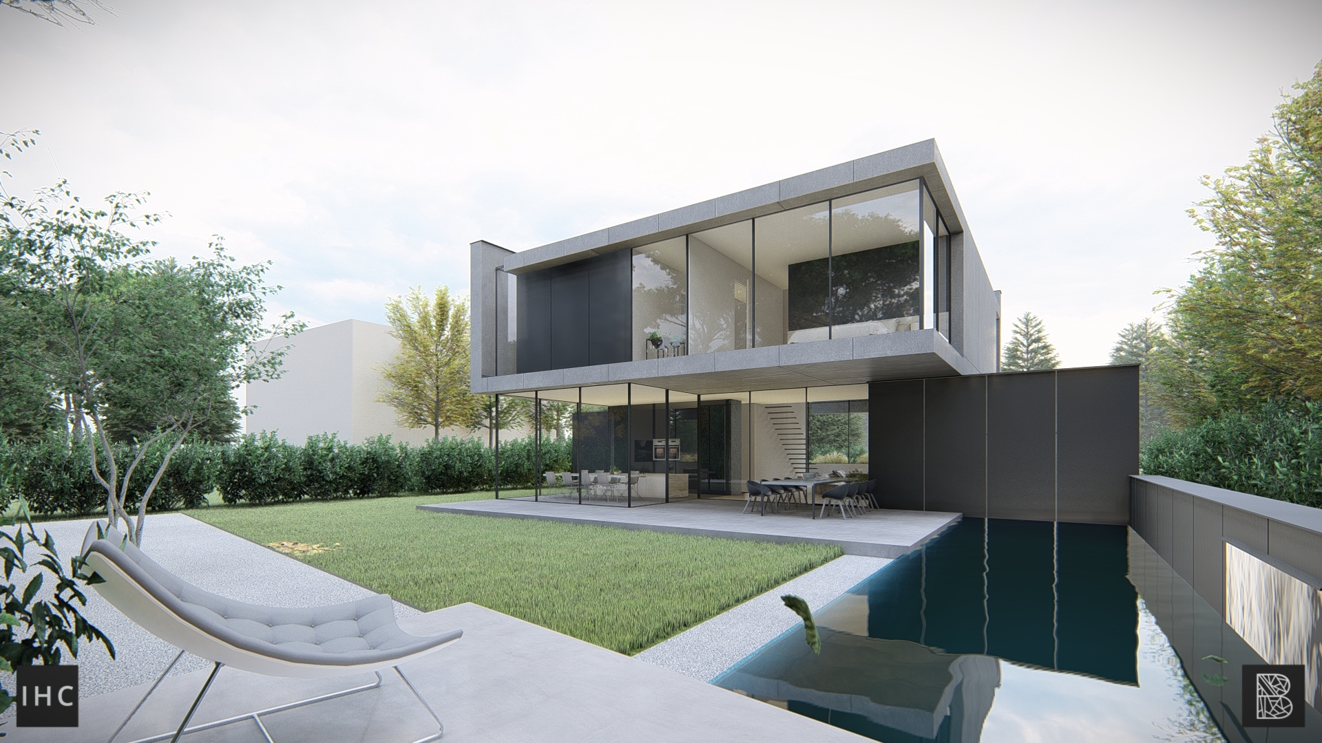 Through a combination of clever structural design, materialisation and usage of glass panels, the upper concrete volume seems to float. This creates a dramatic and dynamic design and also provides a covered outdoor terrace, protected from rain and sun. The large glass panels create an optimal connection with the garden and the koi pond. The pond is framed with architectural lines that extend in the garden, creating a finished composition.