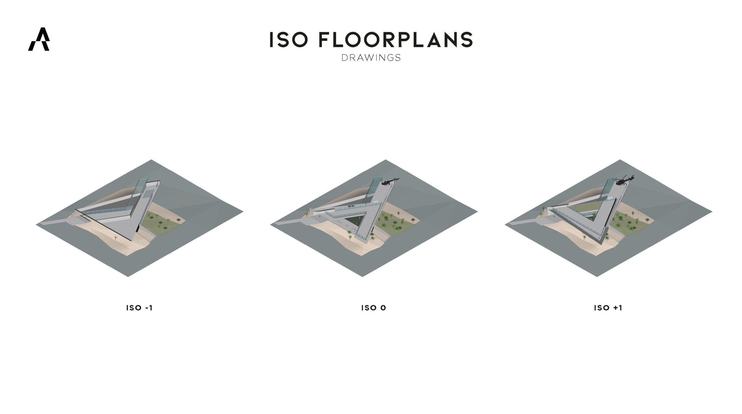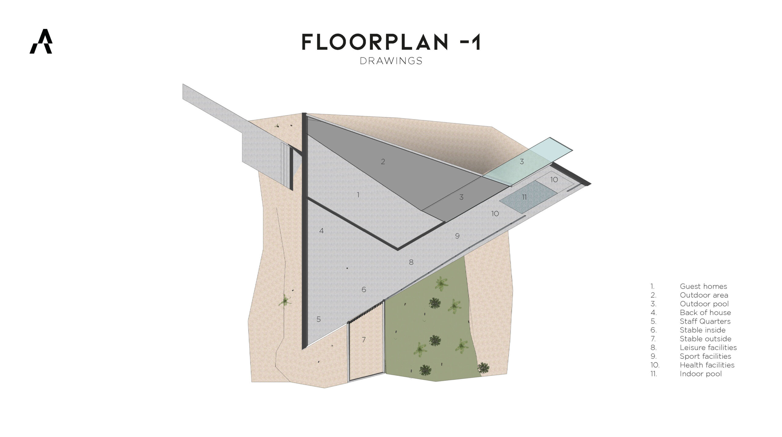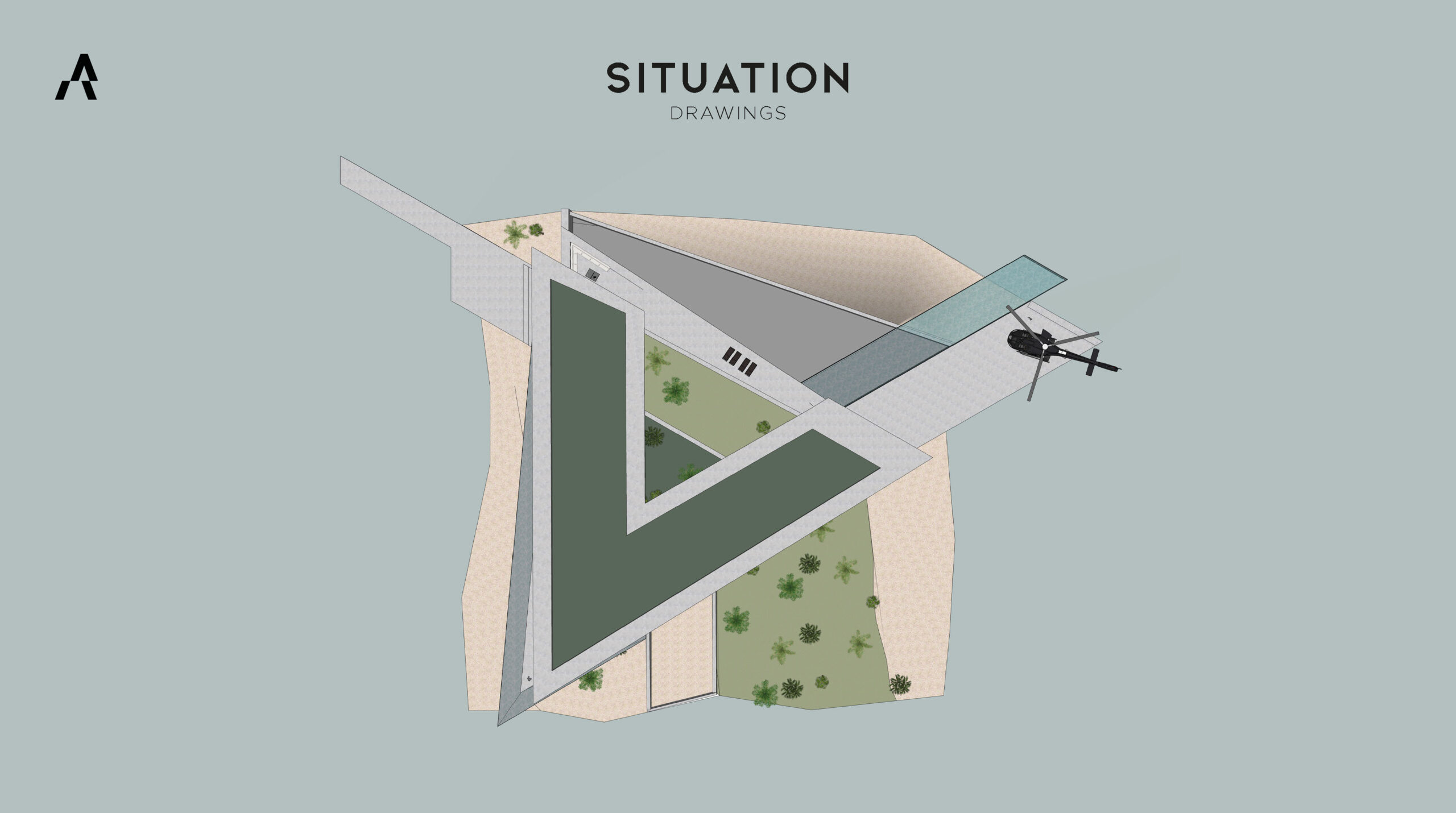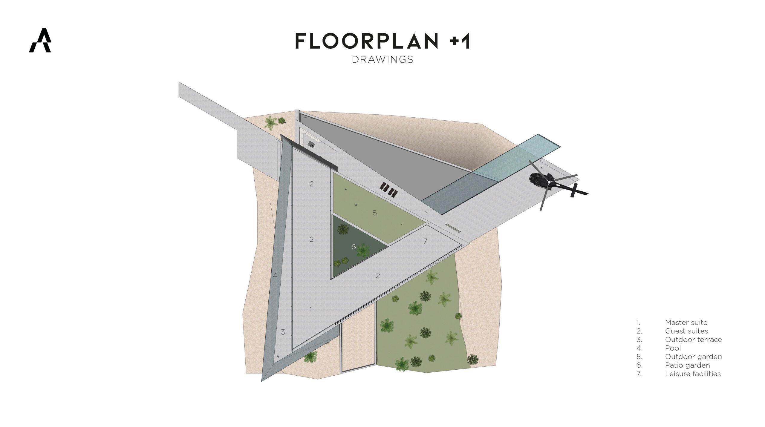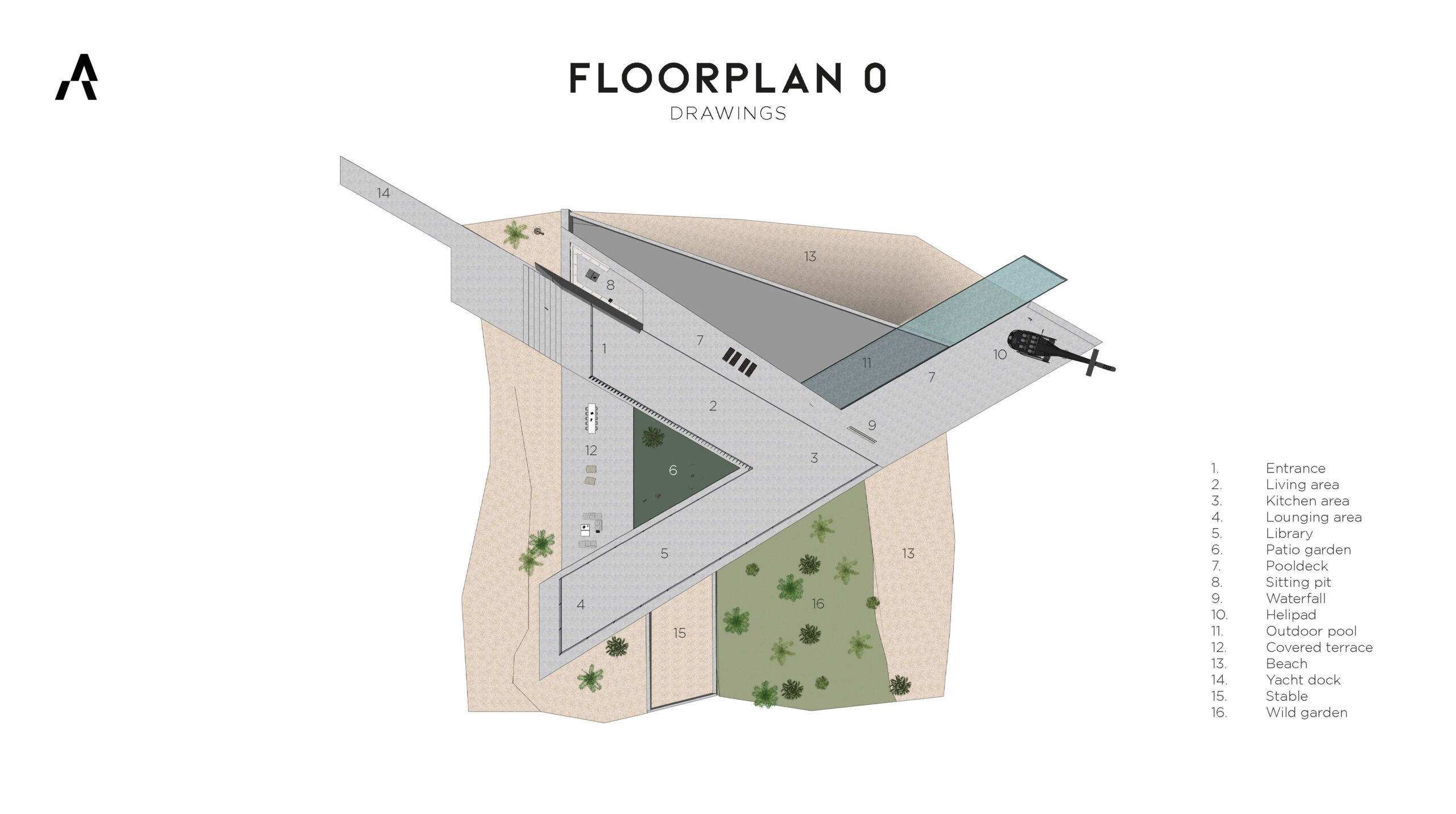 The triangular form of the villa creates unique sightlines from every façade, with each floor oriented differently to provide 360° panoramic views and a distinct spatial experience. At the three converging points of the axes, one extends toward a mode of transport: the helipad, marina, and horse stable. At the heart of the island lies a patio that functions as both central hub and orientation point. The basement is partially embedded into the beach and extends into the sea, while the entire design stands as a bold architectural statement that redefines modern luxury.
