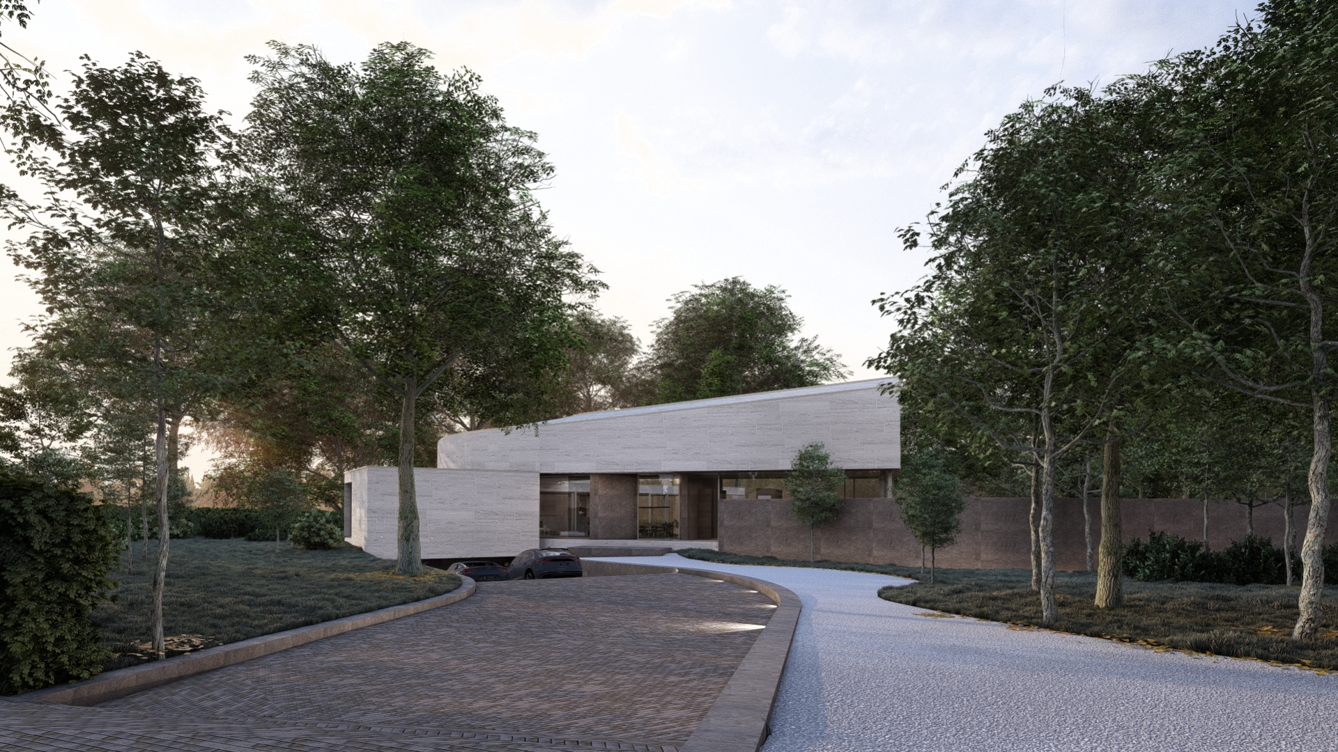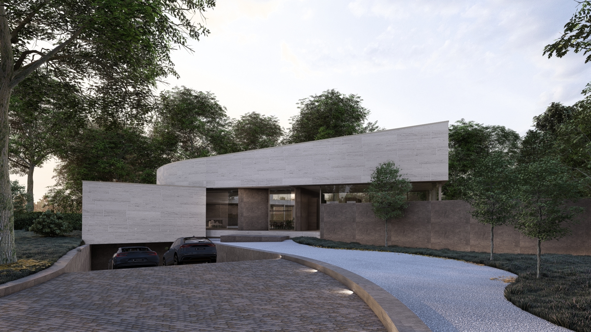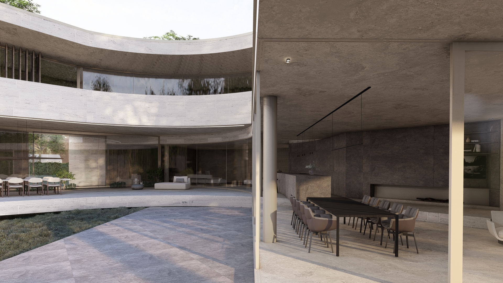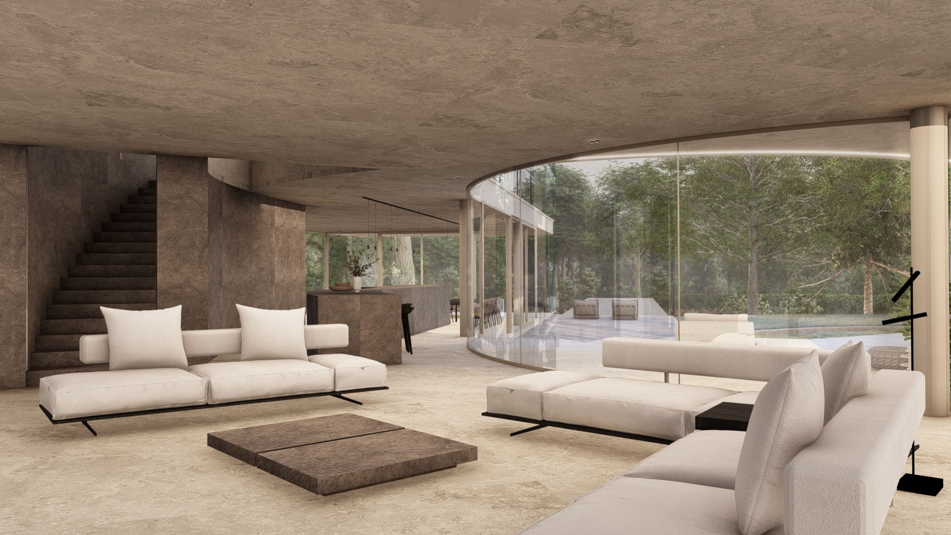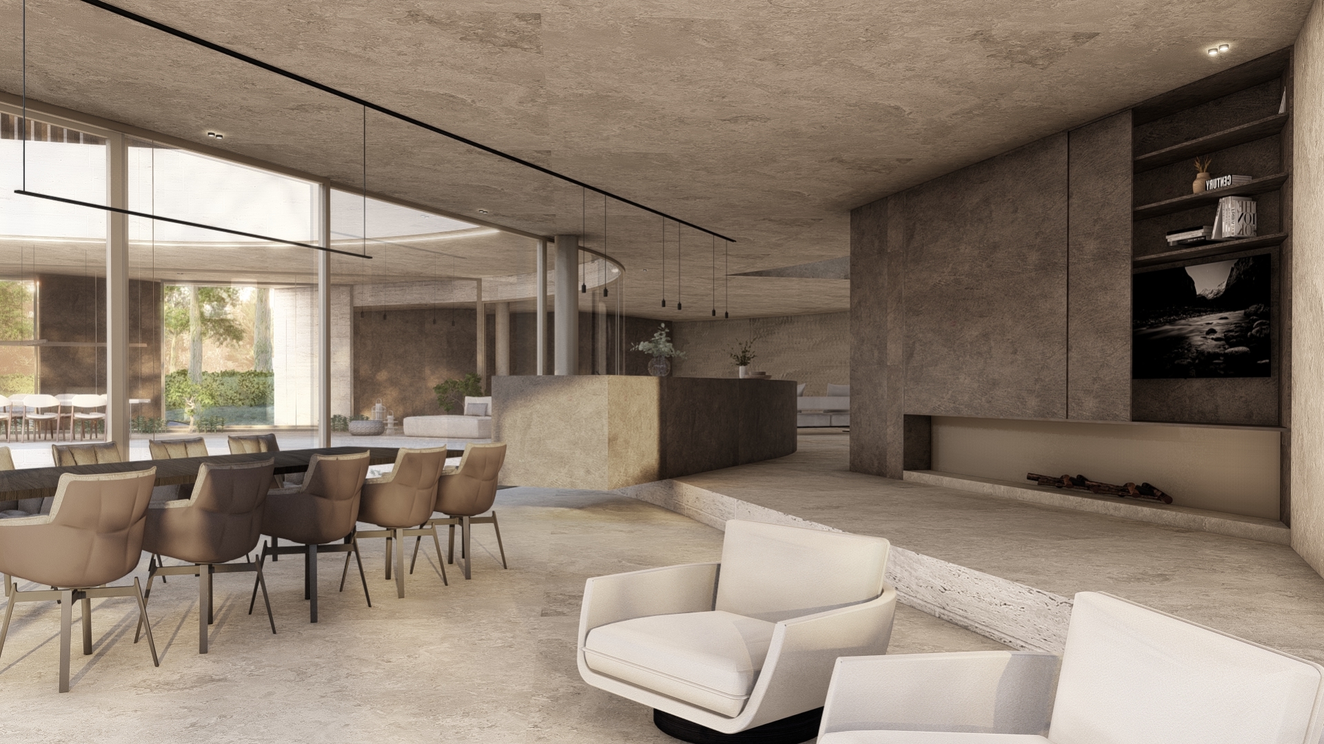 Curved lines, subtle level changes, and carefully placed windows choreograph the movement of light and residents alike. The material palette, anchored in textured stone and smooth surfaces, complements the serene atmosphere throughout the home.