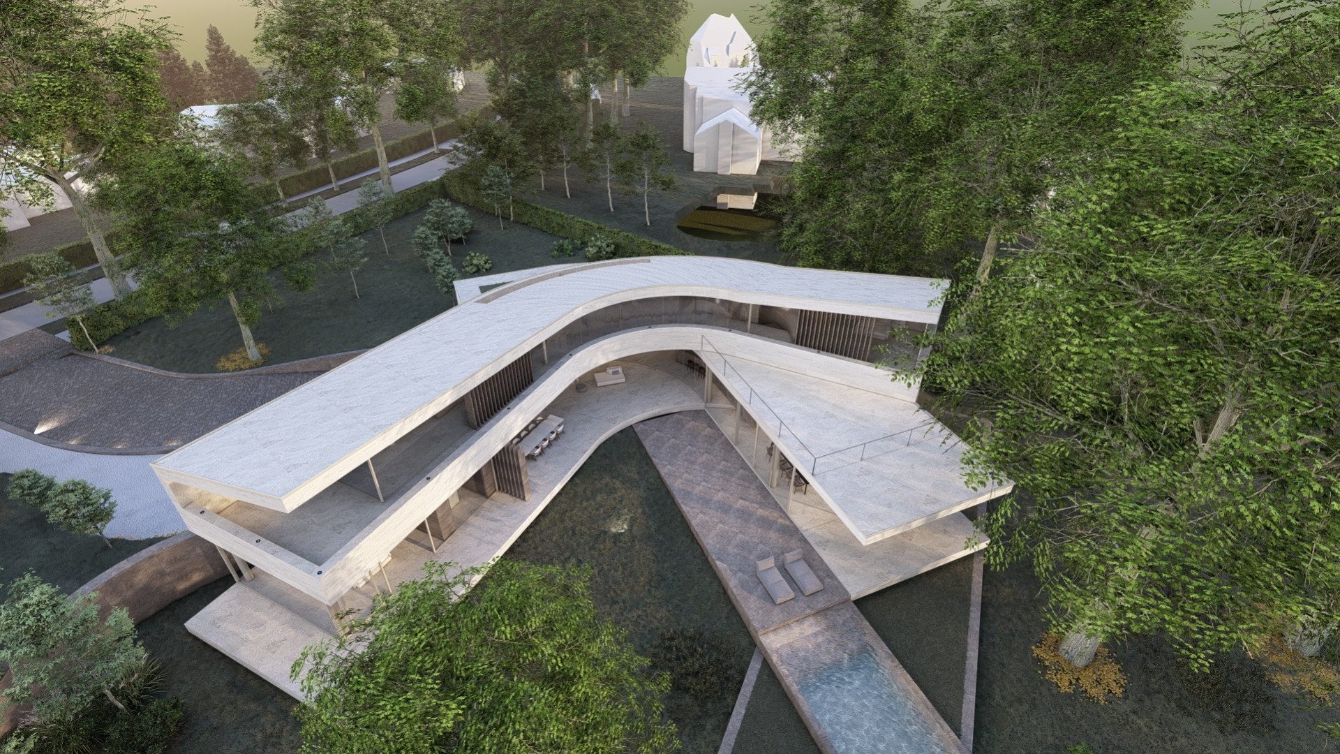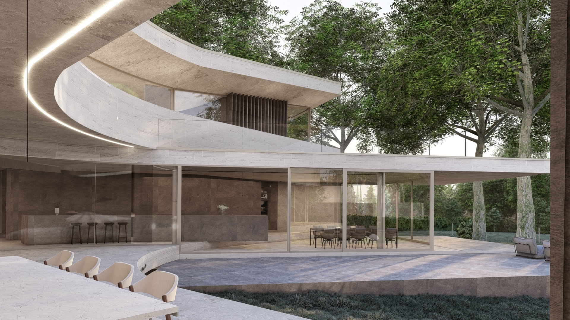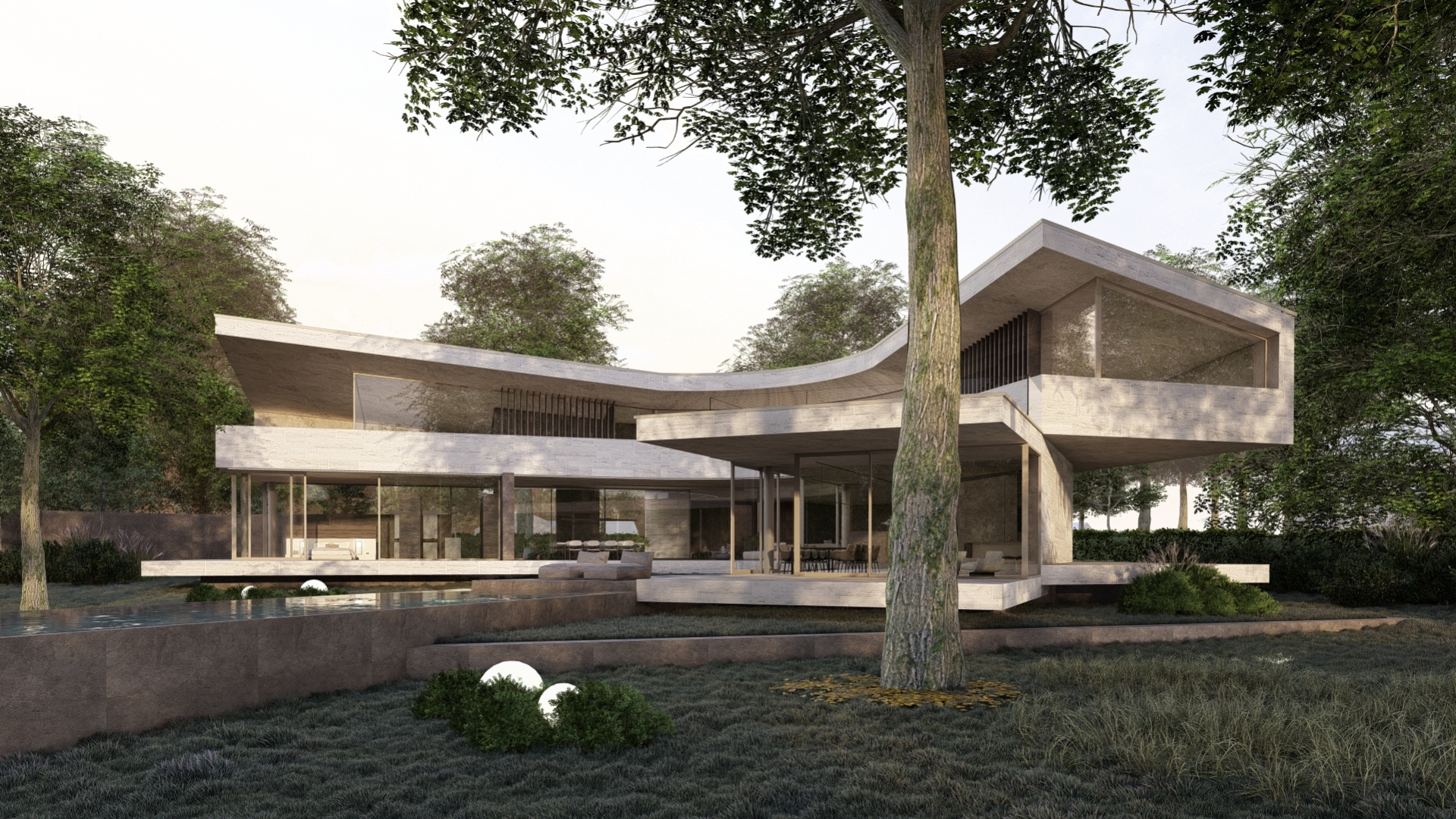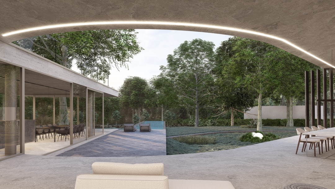 Sinuosity House is a sculptural villa where form follows light and movement. Set amidst a lush, natural setting, the residence is shaped by a central axis that defines both orientation and experience. With elegant curves and carefully composed volumes, the architecture creates a spatial dialogue between inside and outside, privacy and openness.