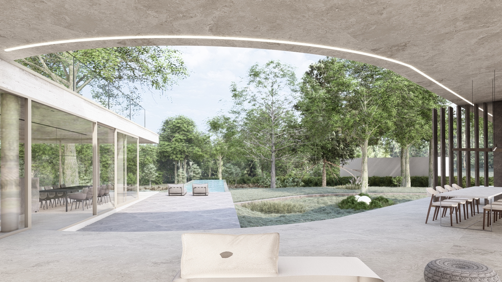 Each space within the house is attuned to the sun’s rhythm, from the early morning kitchen bathed in light, to the tranquil master suite catching the evening sun. The signature gesture: two soft arcs that guide circulation and embrace the landscape. This is a home designed not just to inhabit, but to feel.