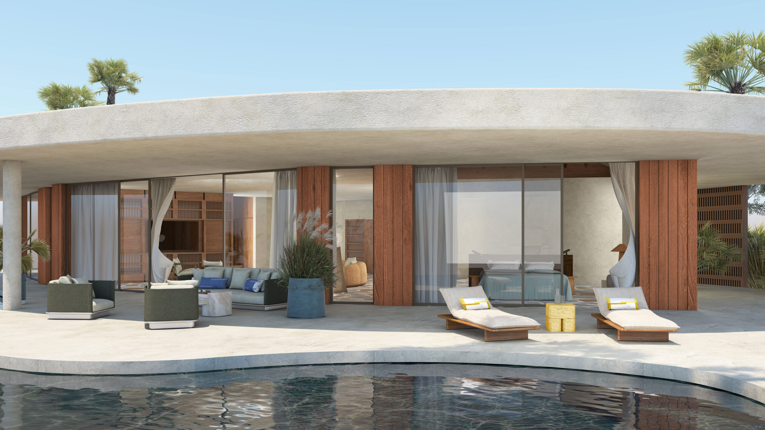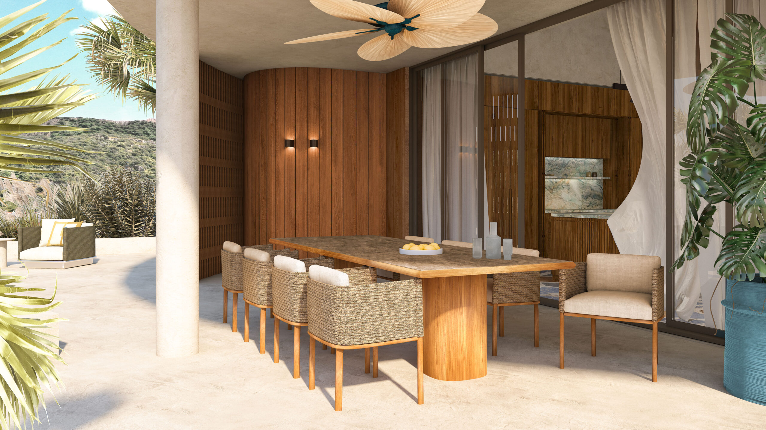 Contrasting textures and materials come together to shape the exclusive concept of Villa Boca 33. Natural elements like limewashed greige render, smoked oak, local black diabas, and cobblestone are seamlessly blended, creating a refined yet organic aesthetic that perfectly suits the Caribbean setting.
