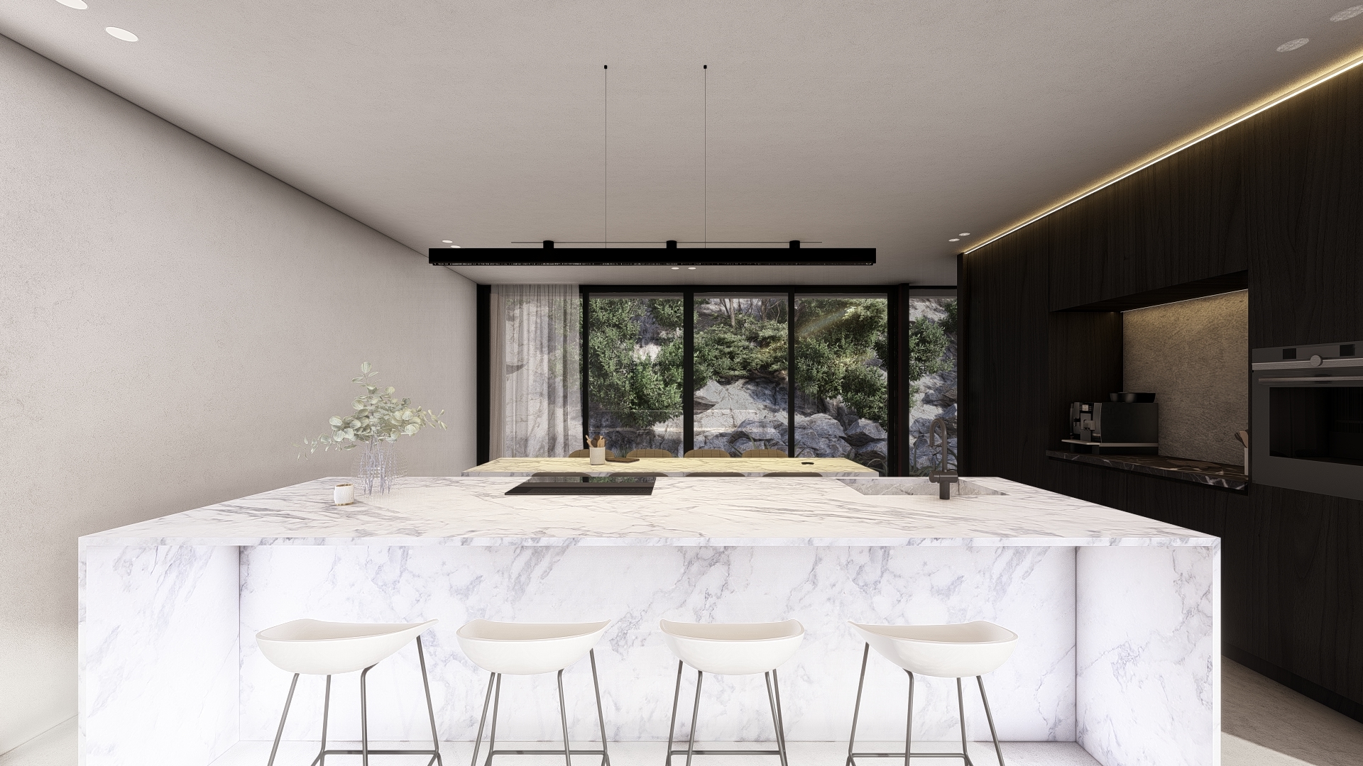 The expansive black-framed glass doors and windows enhance the spaciousness of the main indoor and outdoor living areas, opening up the villa to embrace the stunning surrounding views.