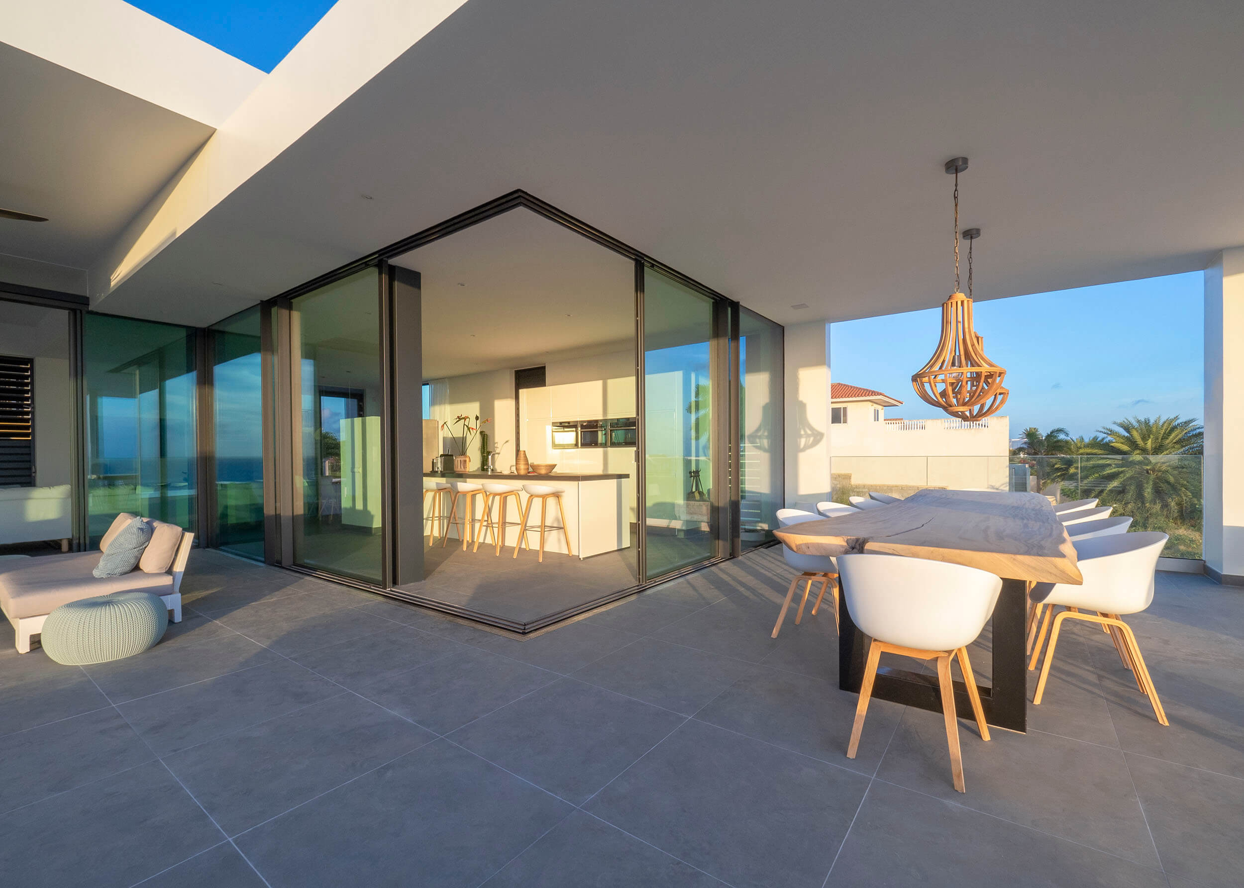 Large minimalistic glass facades are used to open up and connect the main living areas to the large outdoor living area and pool, whilst large light grey floor tiles are used to make sure the indoor and outdoor areas merge perfectly.